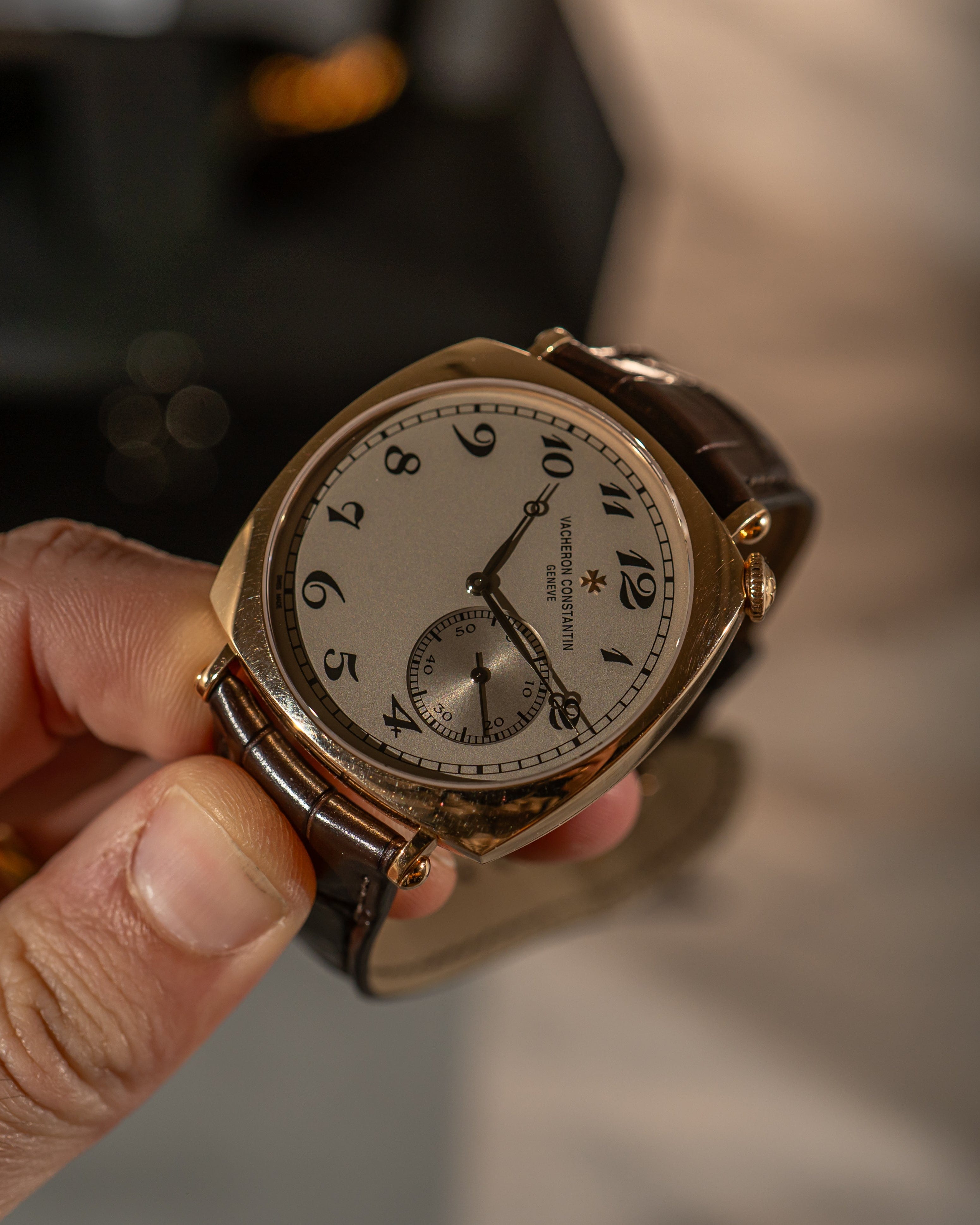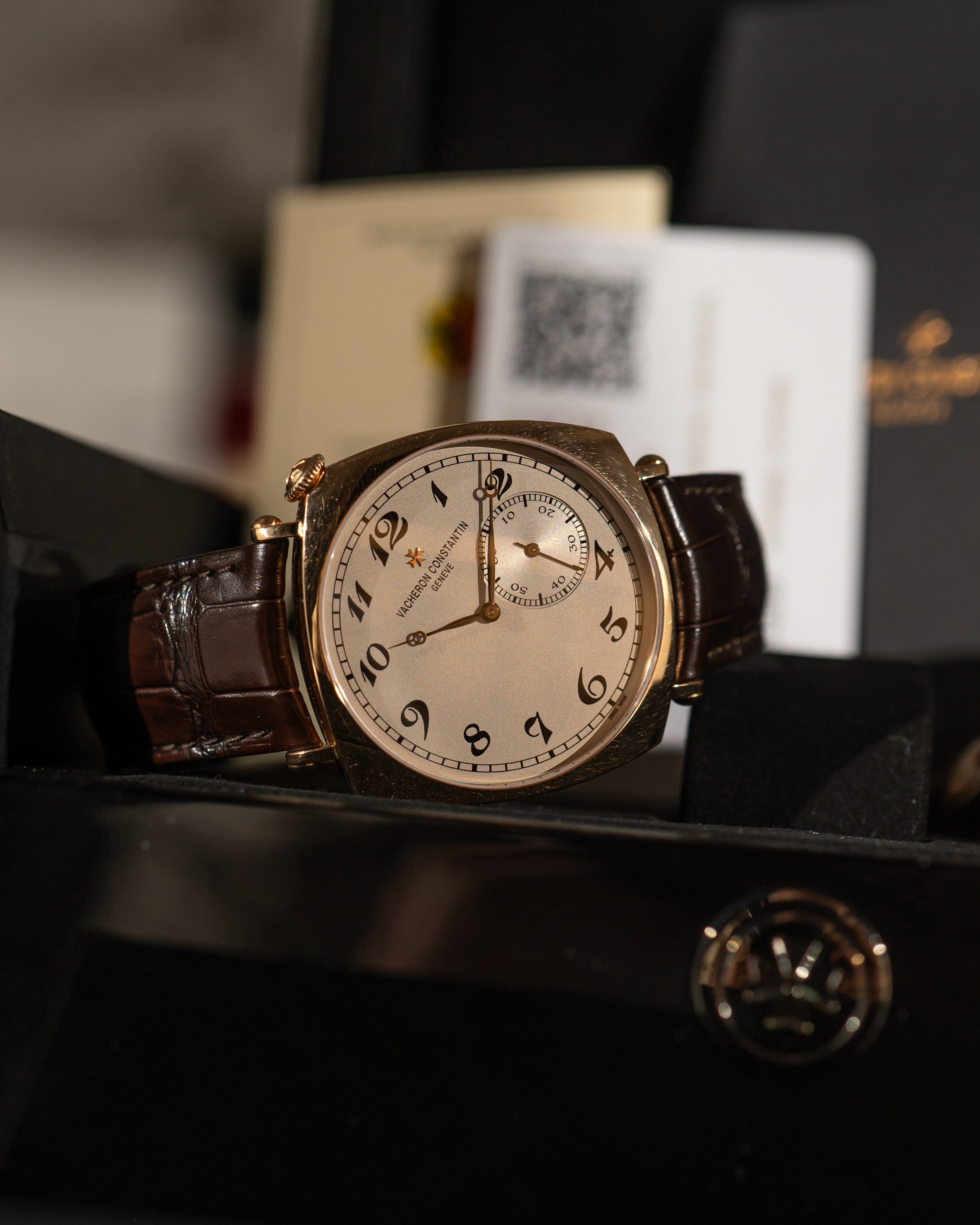 A modern reinterpretation of a 1920s driver's watch, the Vacheron Constantin Historiques American 1921 is distinguished by its off-center dial, cushion-shaped case, and elegant Art Deco charm—crafted here in warm 18K rose gold.