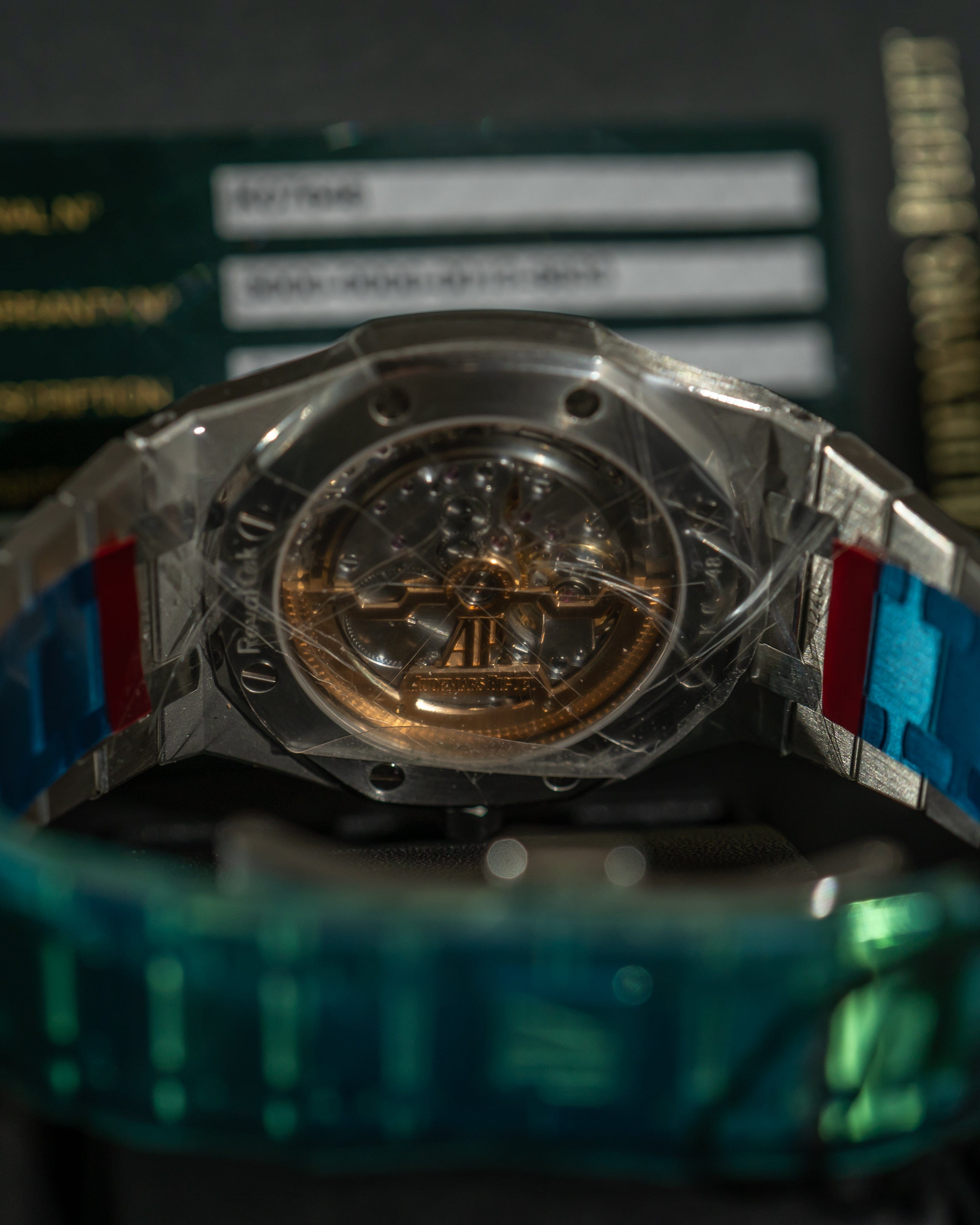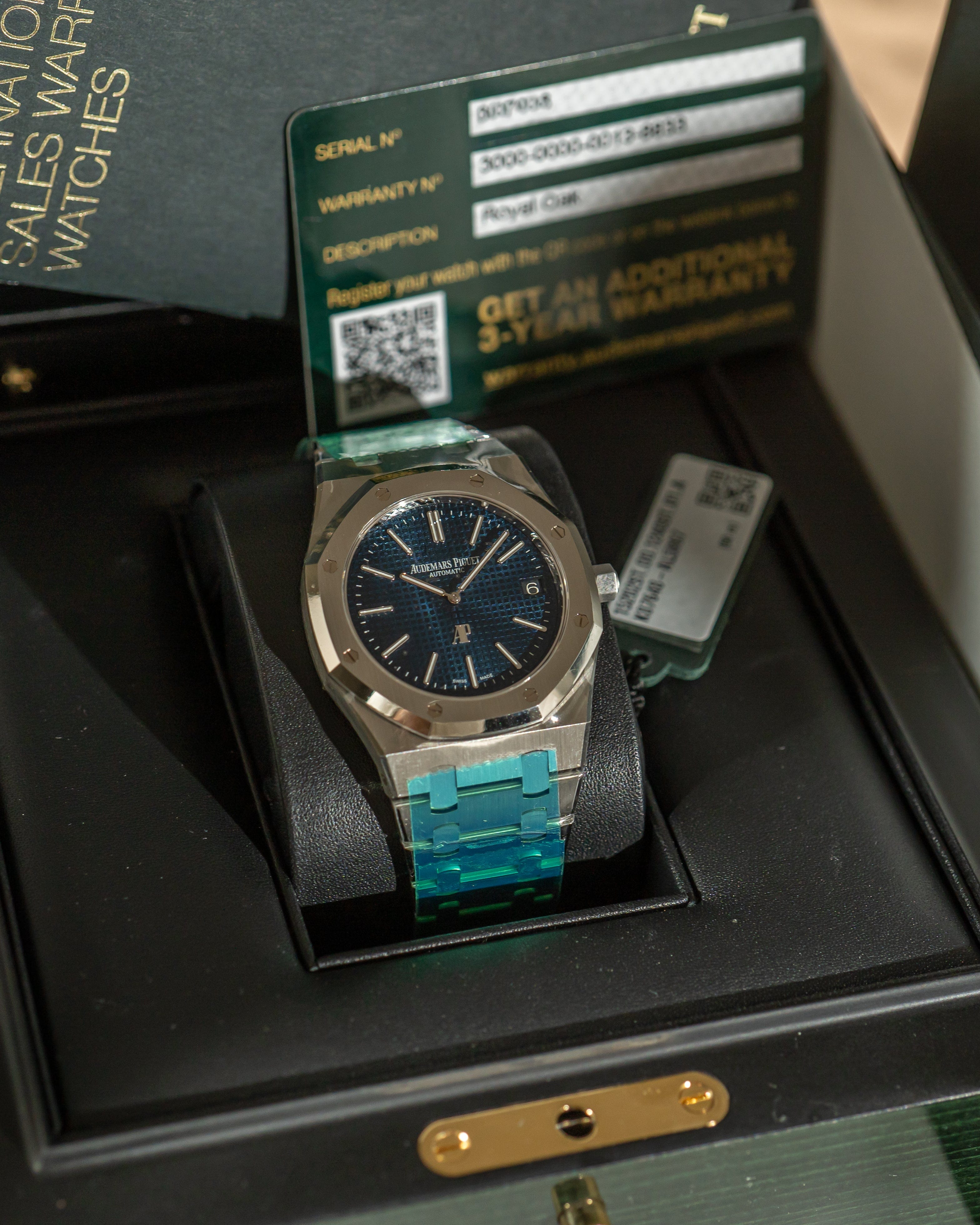 An icon of modern watchmaking, the Royal Oak “Jumbo” Extra-Thin 15202ST is the purest expression of Gérald Genta’s legendary 1972 design. With its 39mm stainless steel case, ultra-thin profile, and stunning blue Petite Tapisserie dial, it embodies the essence of the Royal Oak in its most coveted form.