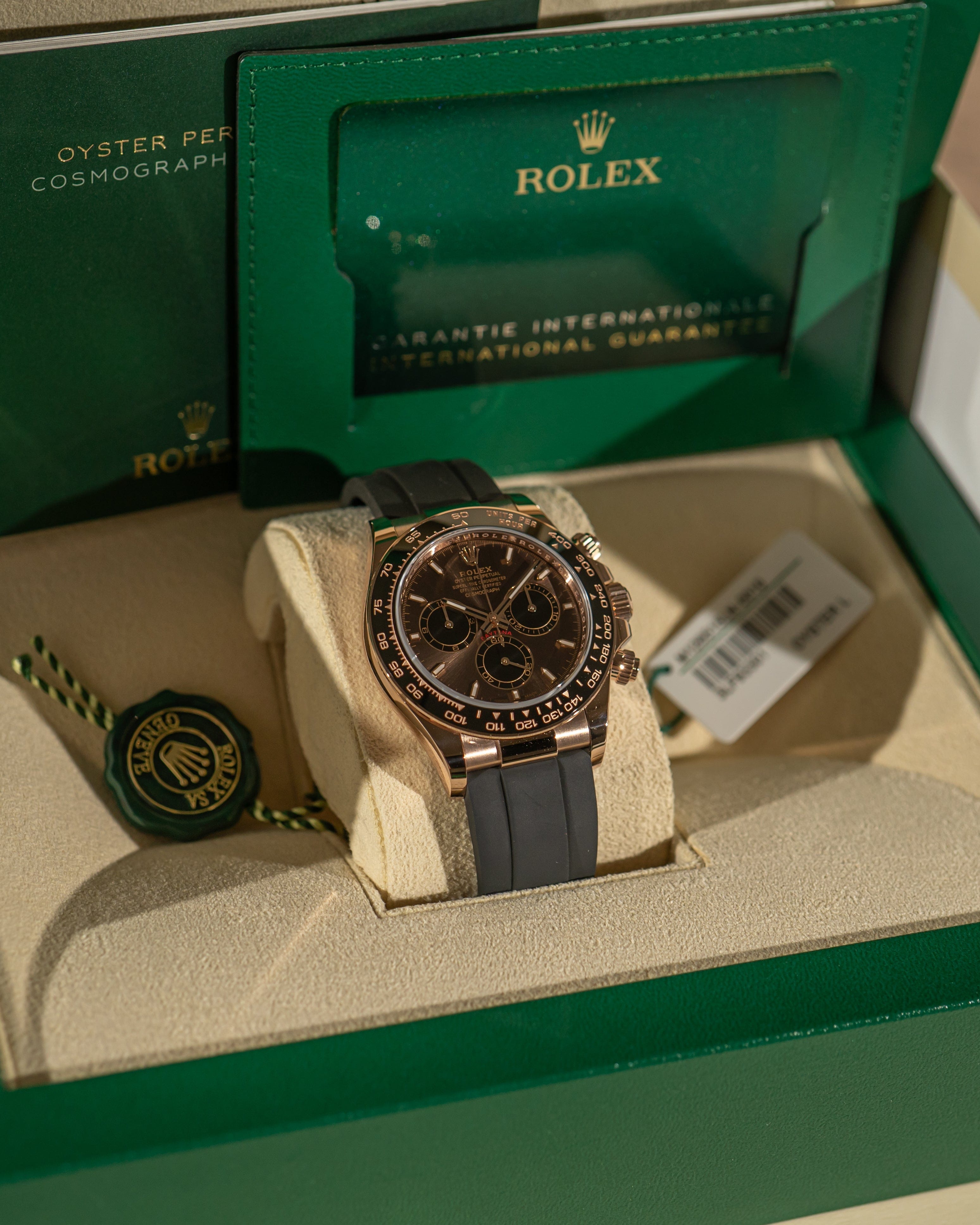 Stunning Everose Daytona 126515LN with black Oysterflex strap and black dial with rose accents. Fully factory-fresh and unworn — perfect for both collectors and VAT-registered buyers (25% VAT included).