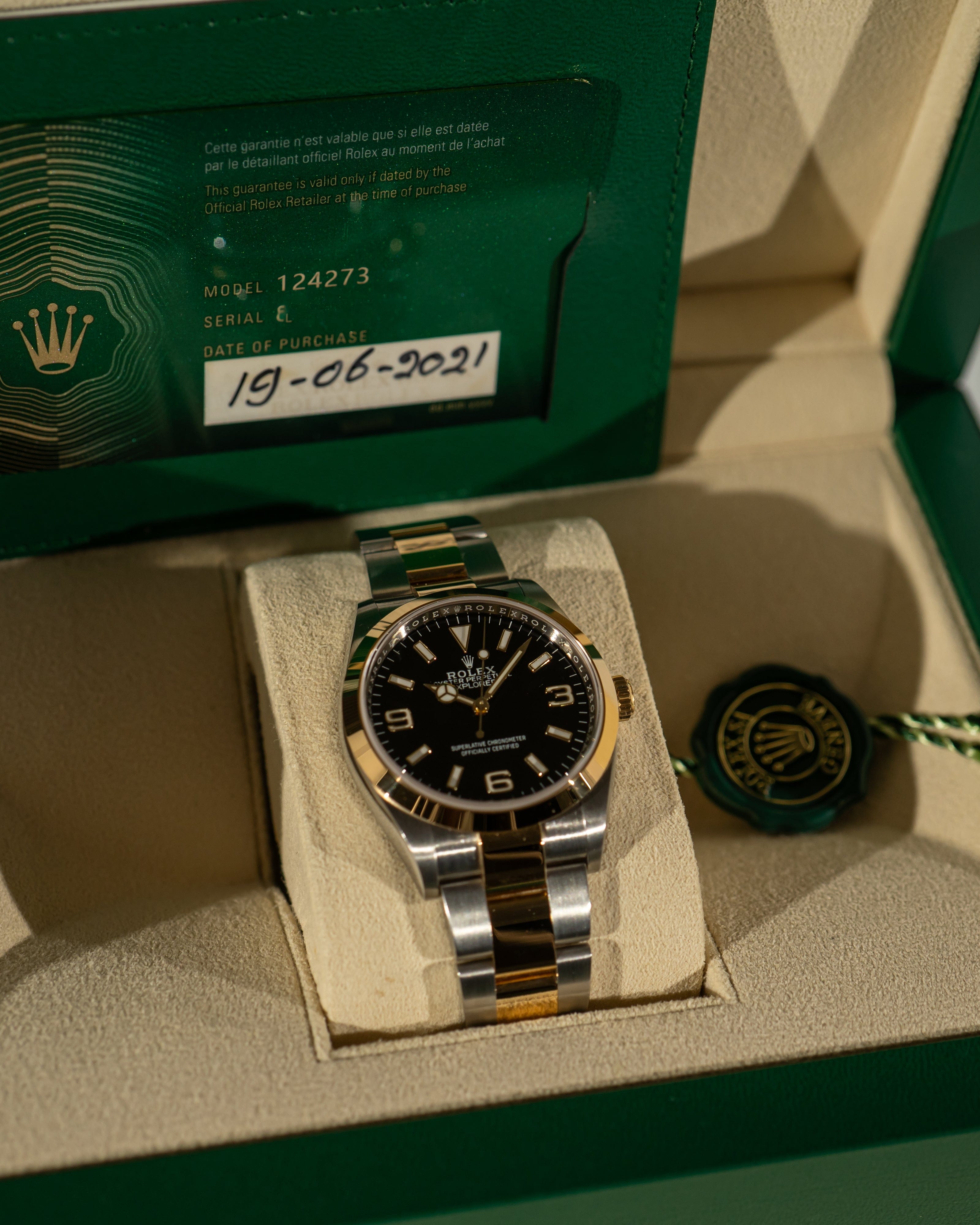 The 124273 blends heritage Explorer DNA with luxurious two-tone construction, making it one of the most versatile modern Rolex releases — especially desirable in unworn full-set condition.