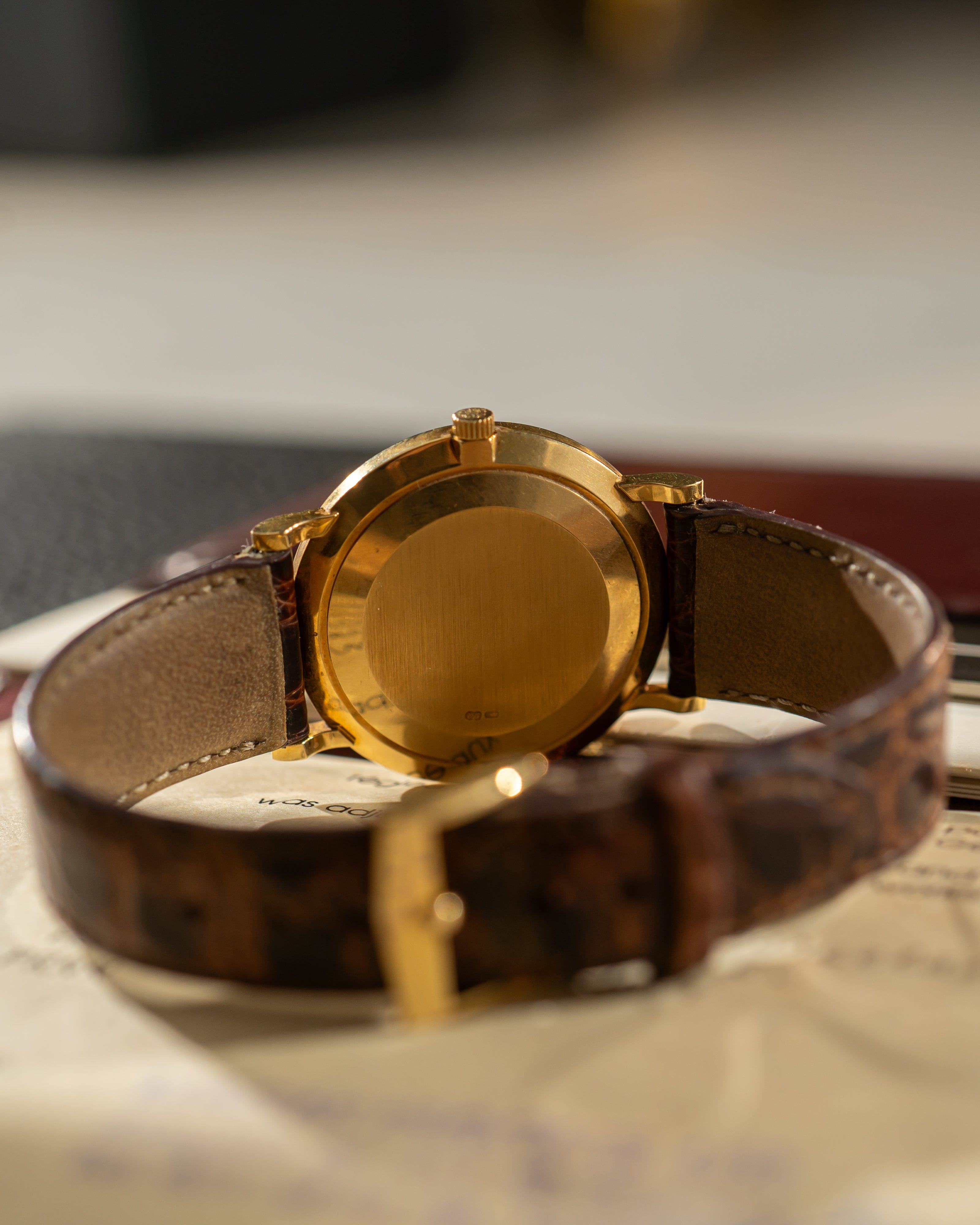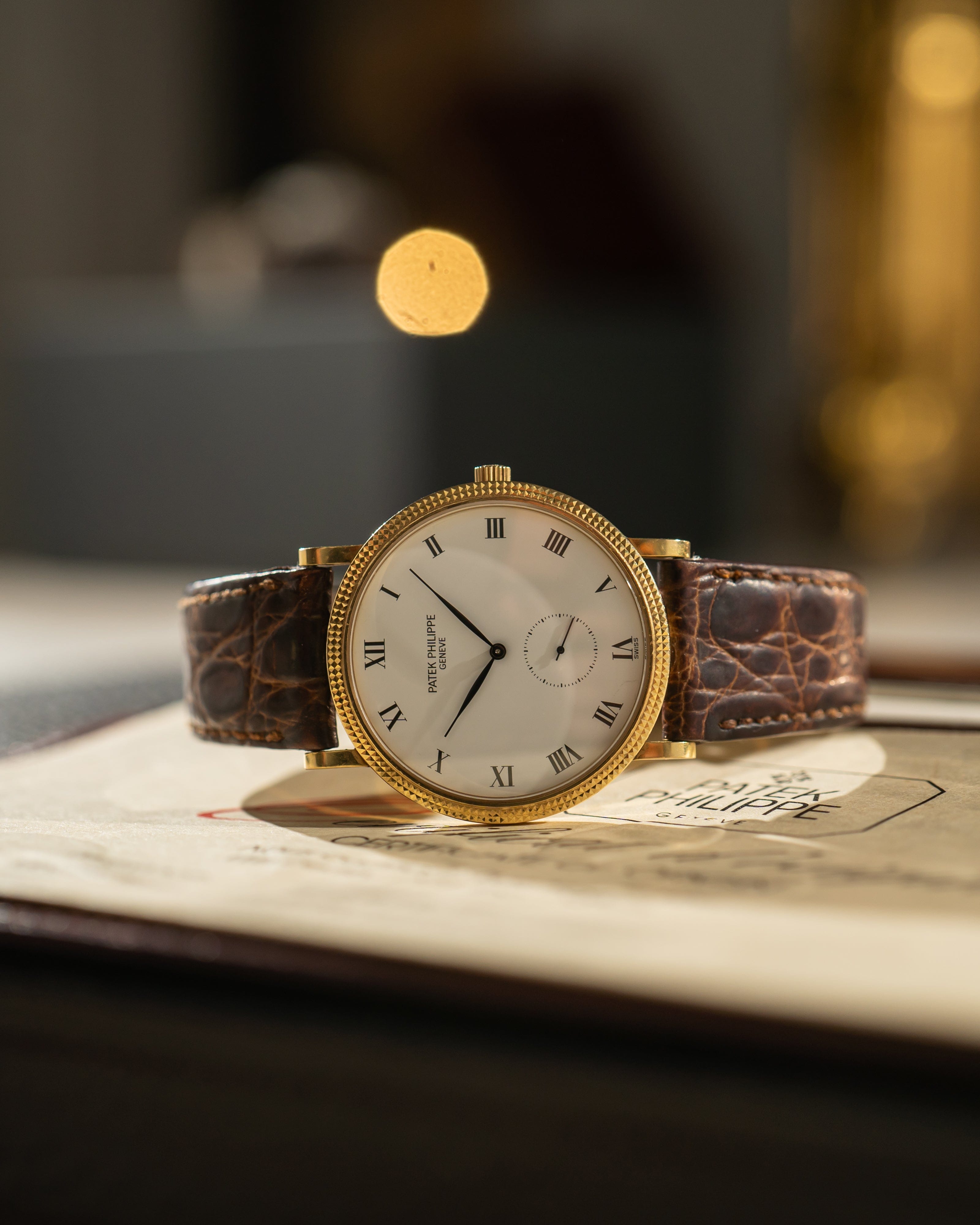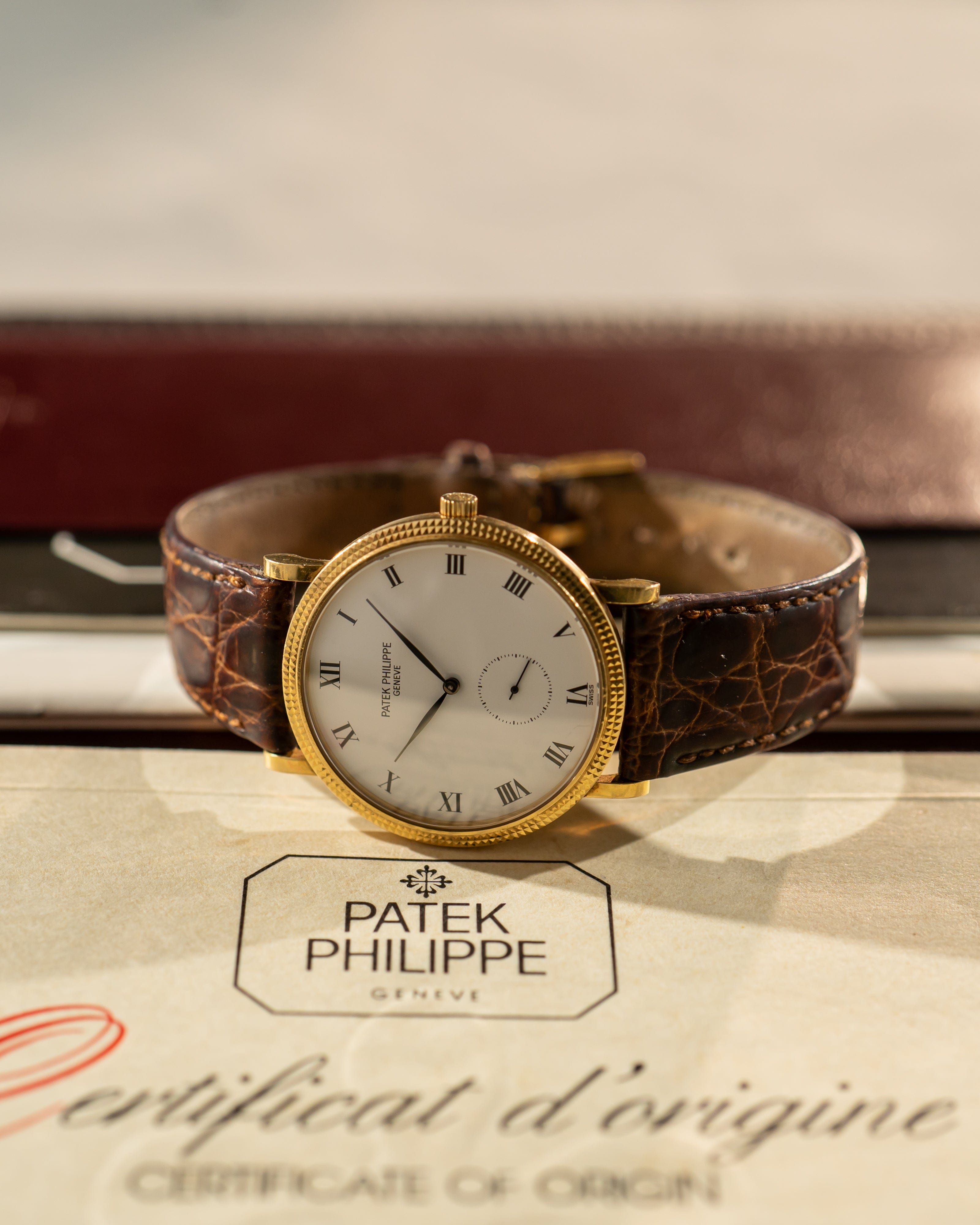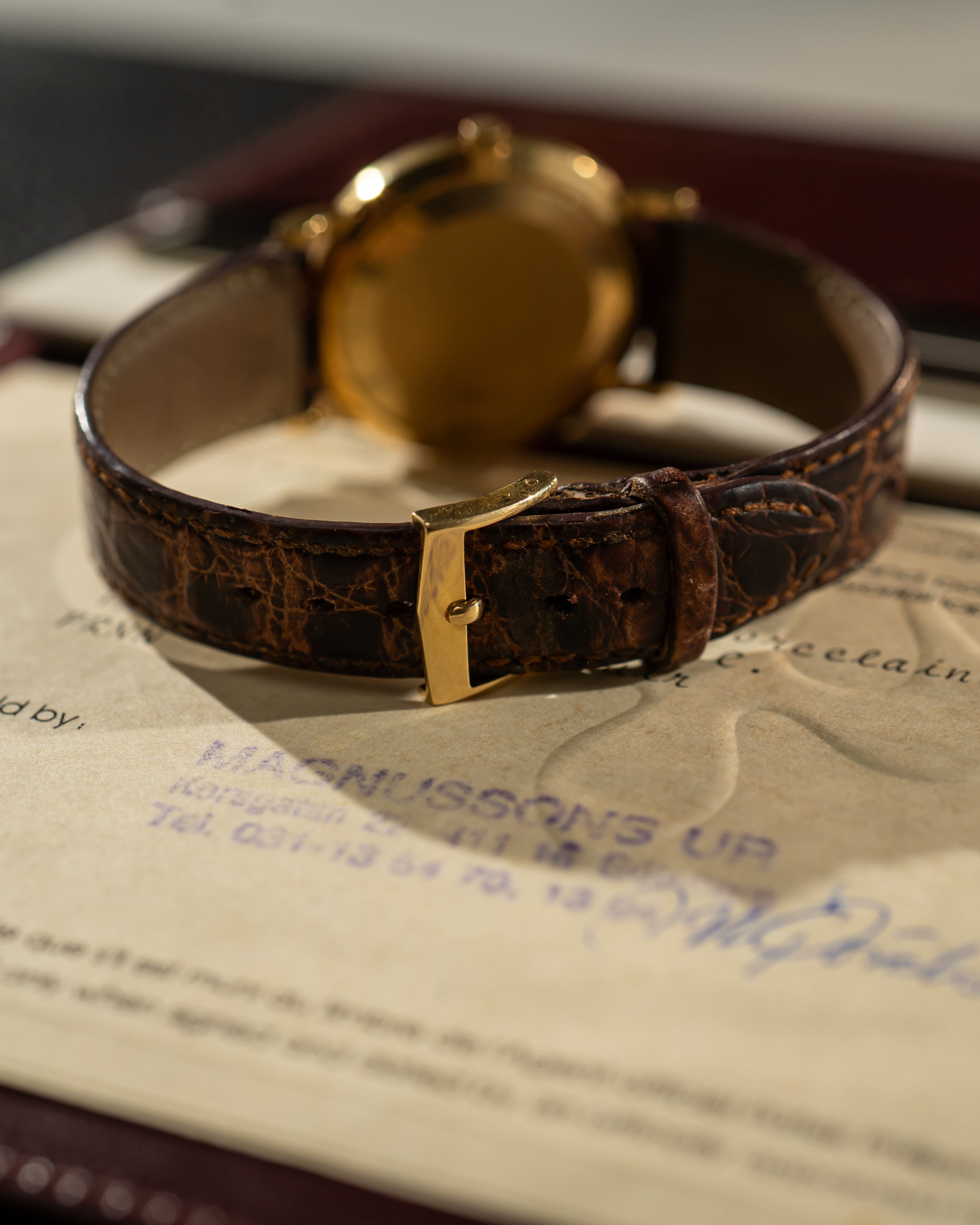 • Strap: Brown leather strap with gold Patek Philippe pin buckle