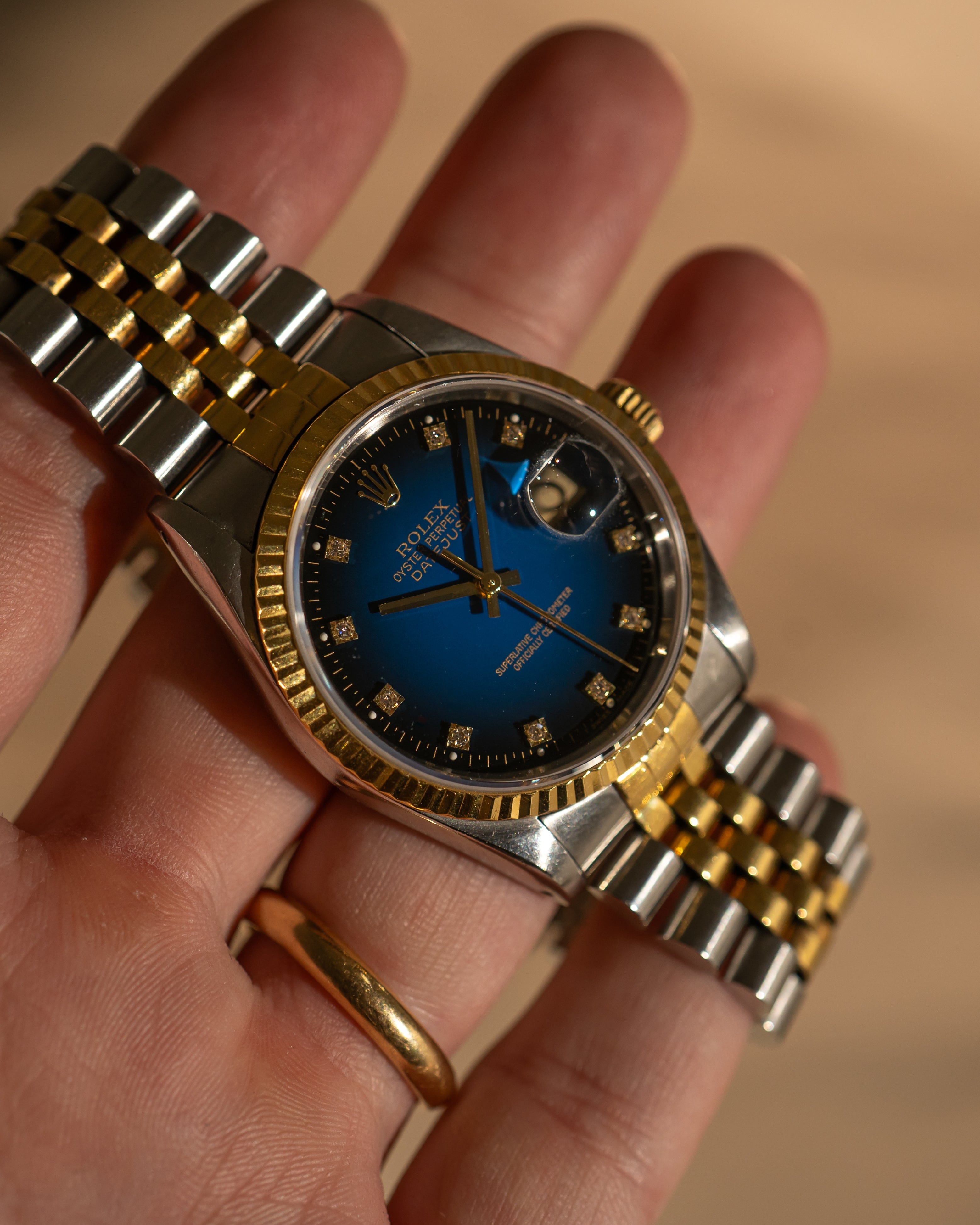 A striking take on the classic Datejust, this Rolex ref. 16233 features a rare and vibrant blue vignette dial with factory-set diamond hour markers—an elegant fusion of traditional design and vintage flair.