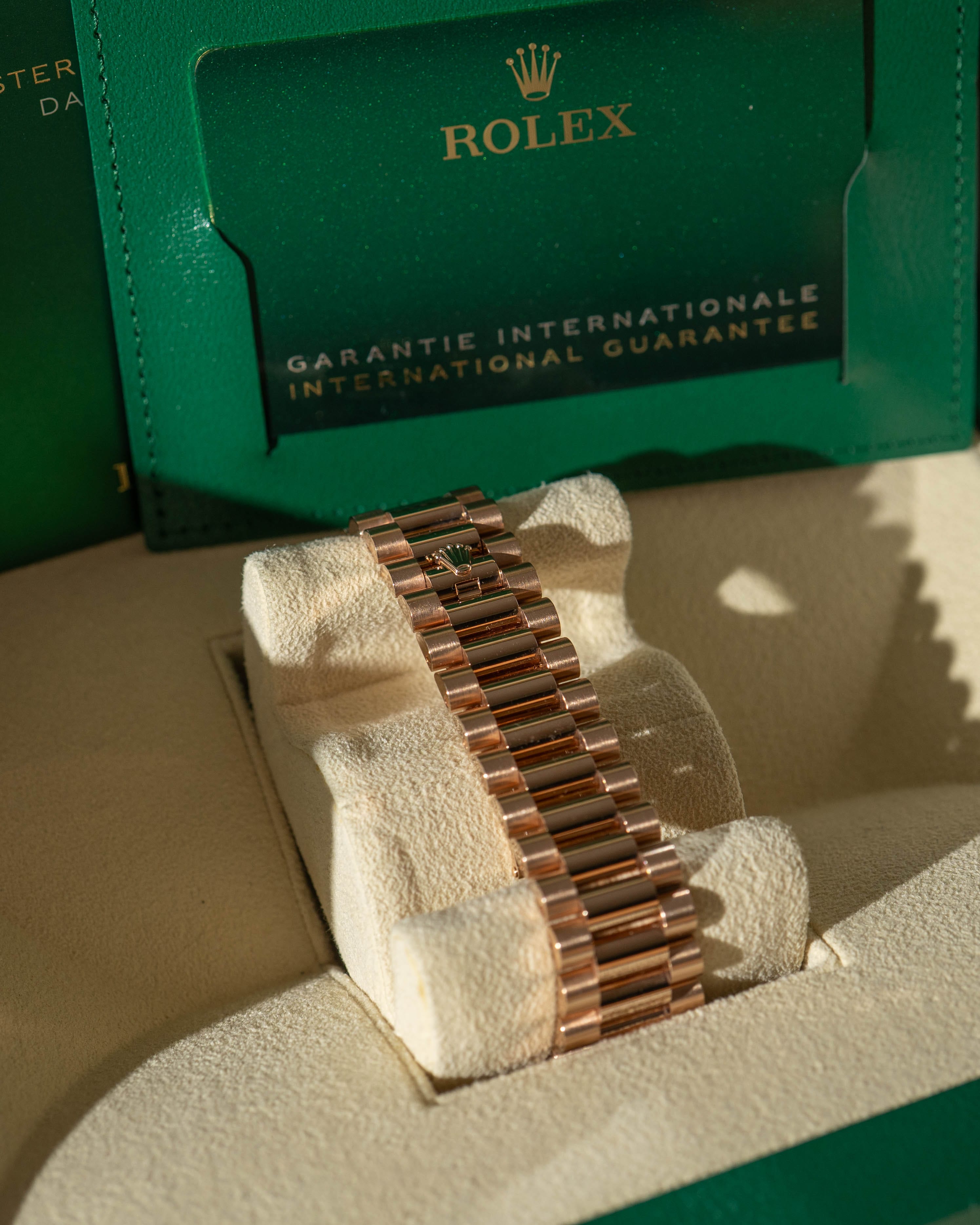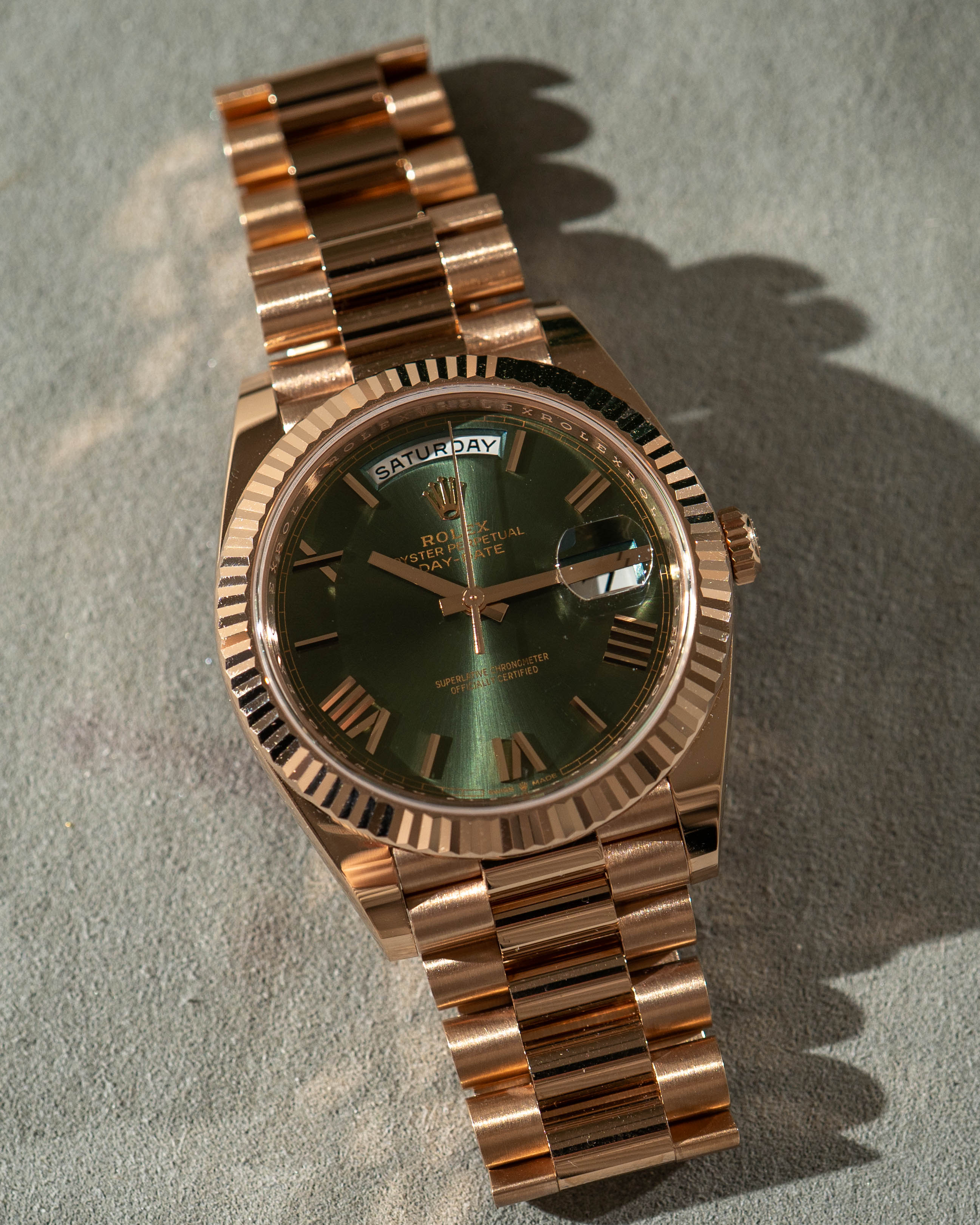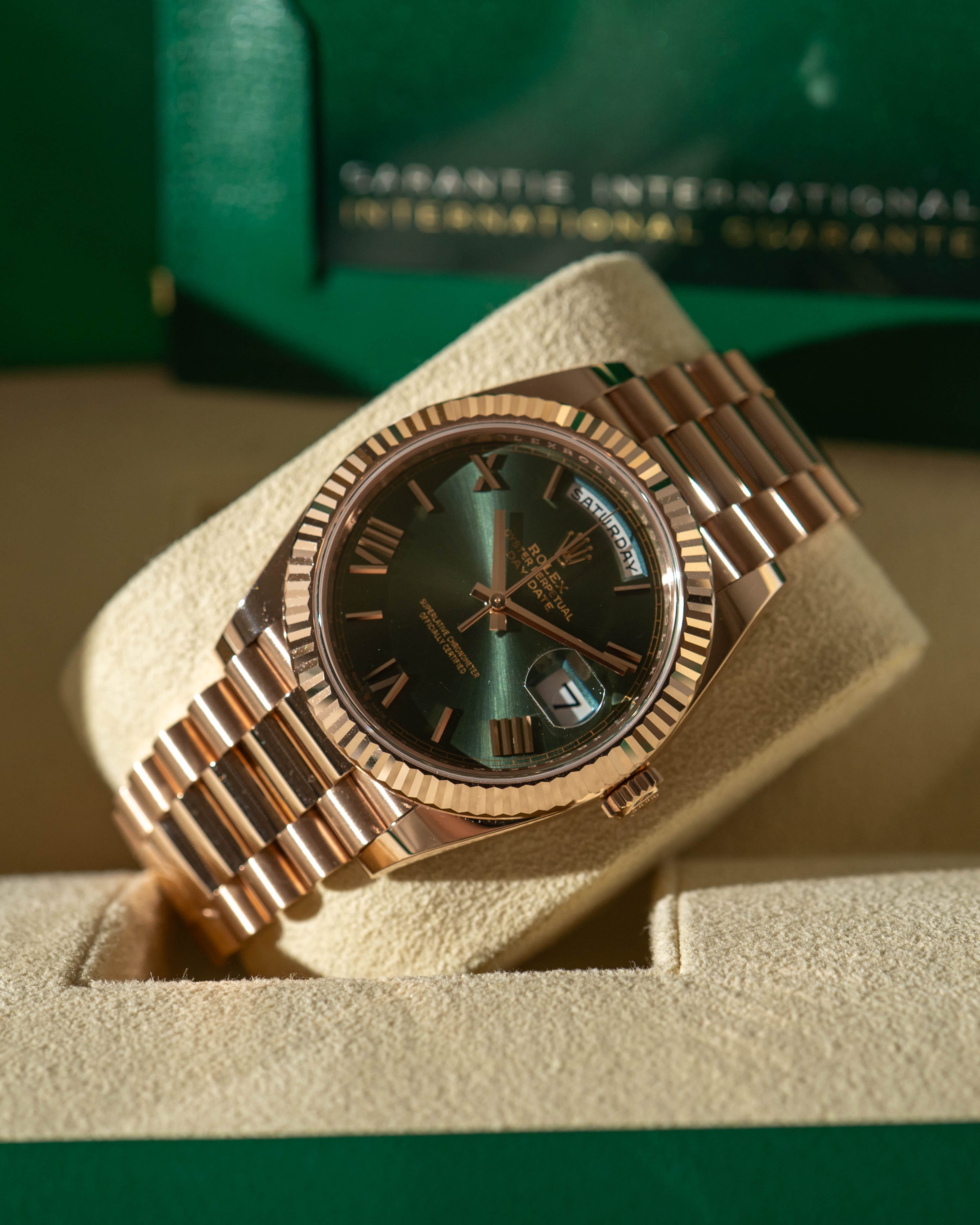 A modern classic and one of the most desirable Day-Date configurations, this Rolex Day-Date 40 in 18k Everose gold features the iconic olive green sunburst dial, a combination reserved exclusively for Everose Day-Dates.