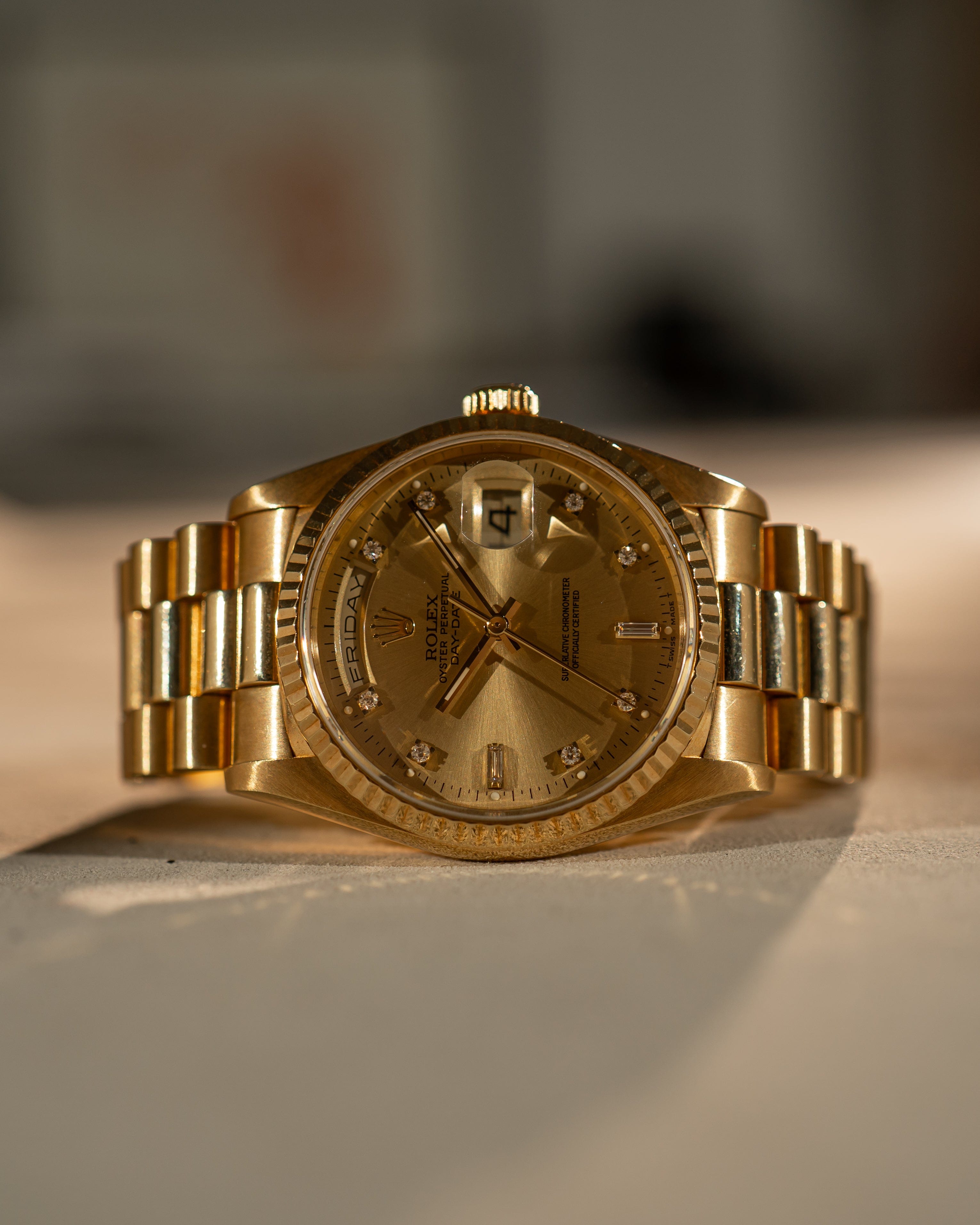 A symbol of prestige and timeless elegance, this Rolex Day-Date 18238 in solid 18k yellow gold features a champagne diamond dial and the iconic President bracelet—an enduring statement of status and refinement.