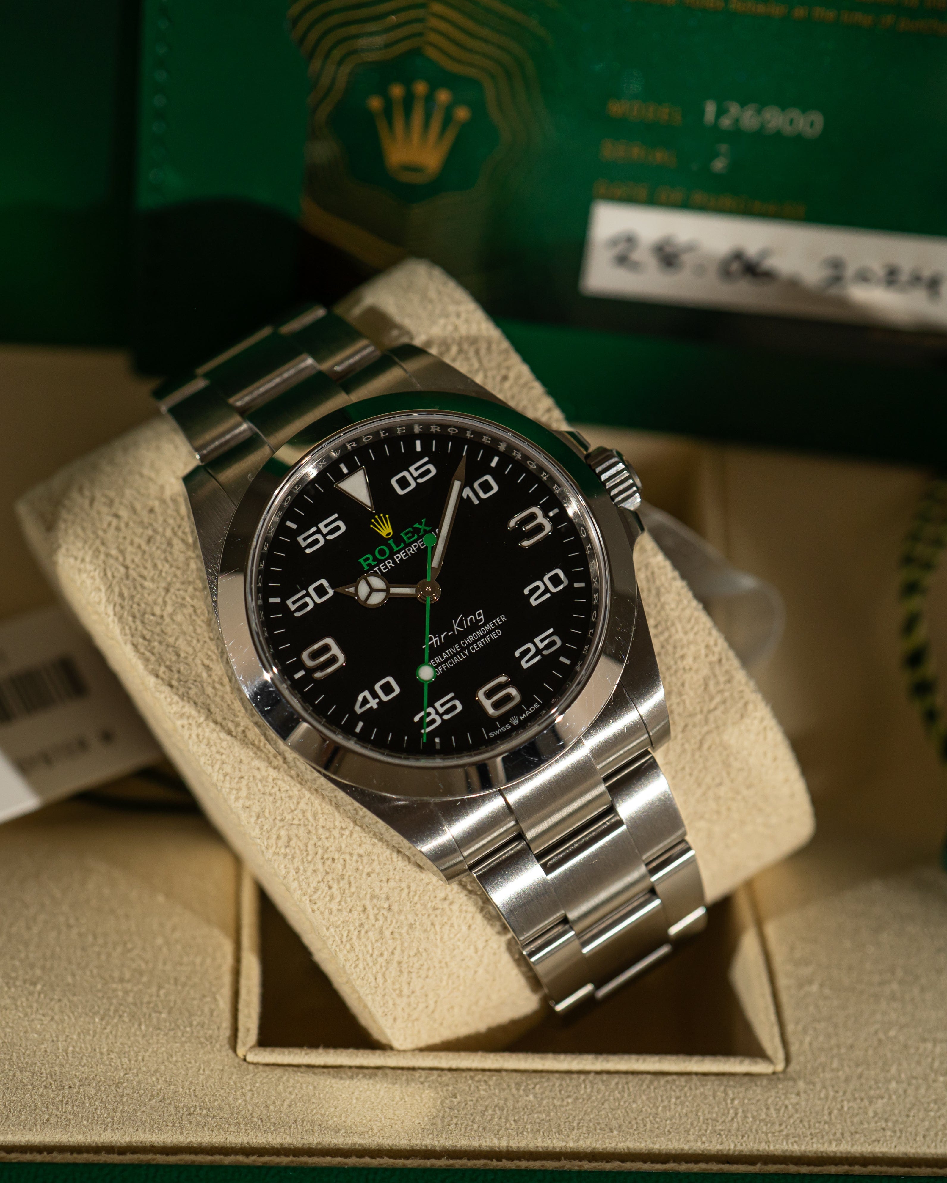 A bold update to a classic, the Rolex Air-King 126900 blends aviation heritage with modern refinement—featuring an updated case, crown guards, and a sportier Oyster bracelet with Easylink comfort extension.
