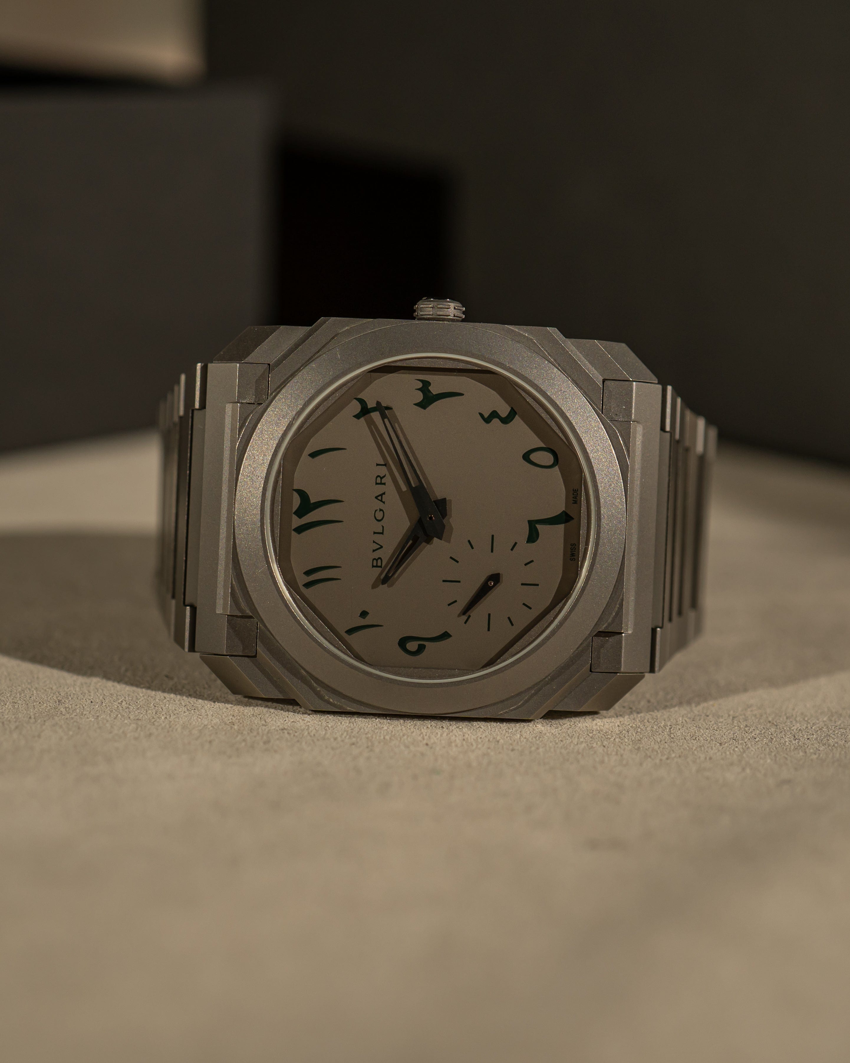 An ultra-thin marvel of modern watchmaking, the Octo Finissimo 103023 delivers architectural boldness in sandblasted titanium, paired with a rare Eastern Arabic numeral dial—a sleek fusion of Italian design and horological innovation.